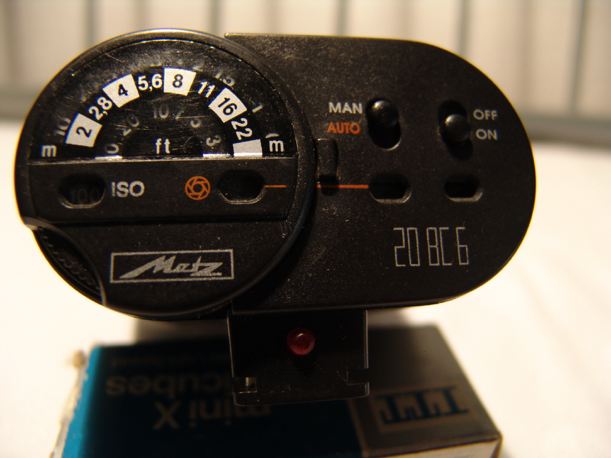 Metz Megablitz 20 BC6kleiner mobiler Aufsteckblitz von Metz Mittenkontaktgesteuert Autofokus-Automatik und Manuel nutzbar Entfernungs und Blendetabelle auf der Rückseite Bereitschaftanzeige inkl. Streuscheibe für den Nahbereich TEST Knopf Betrieb mit AA Batterien oder Akkus Gebraucht, Gebrauchsspruren, guter Zustand