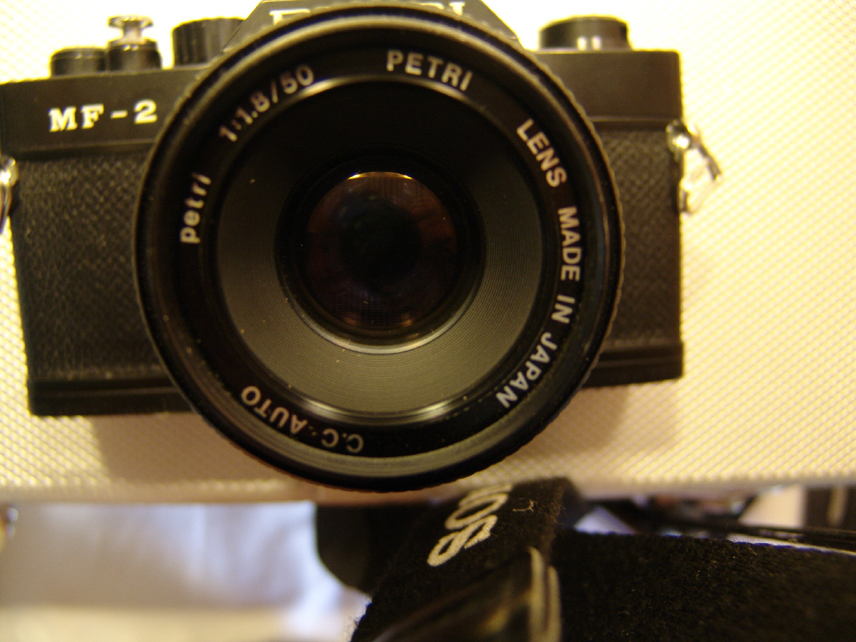 Diese Petri ist eine Kleinbild-Spiegelreflexkamera aus dem M42-System. Hinter der Firma Petri verbirgt sich ein japanischer Hersteller, der seit 1907 unter anderem Kameras herstellte. In den 1960ern wurde die Firma bekannt, da sie Technik, die mit Nikon-Kameras vergleichbar waren, zum halben Preis anbot. 1977 ging die Firma bankrott, arbeitete aber noch einige Jahre weiter. Eine der letzten gelistete Kameras vor dem Bankrott war die MF-1, daher lässt sich bei der MF-2 nur abschätzen, dass sie ca. um 1980 gebaut wurde.